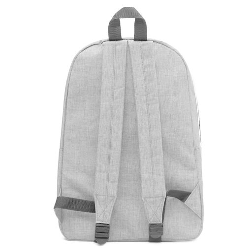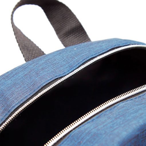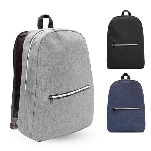 Mochila realizada en poliester con doble compartimento, uno grande principal y otro mas pequeño tipo bolsillo frontal con cierre.