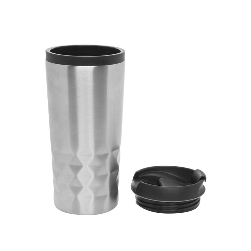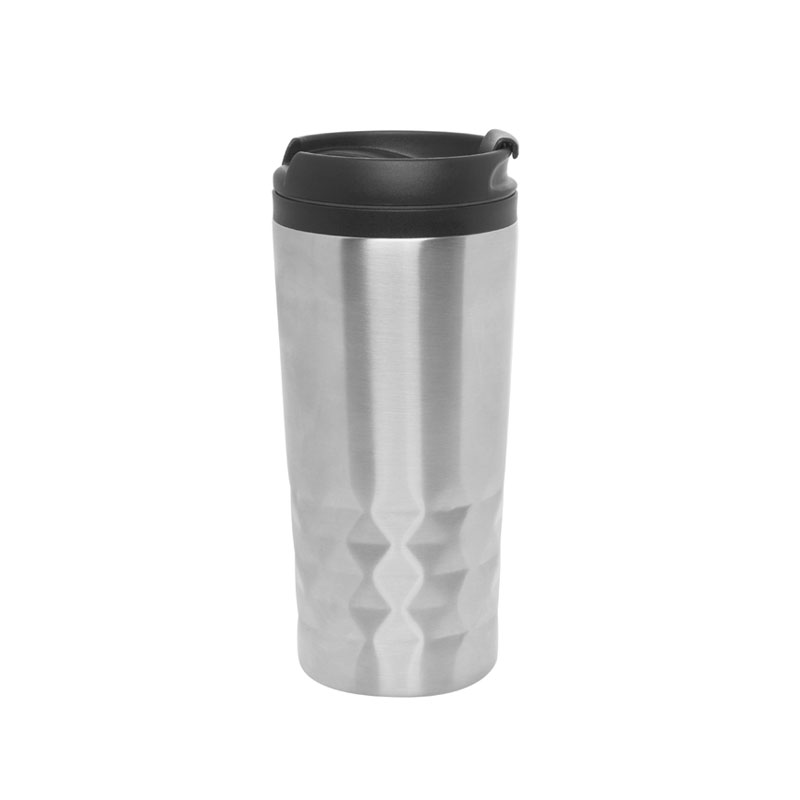 Jarro térmico metálico con tapa a rosca de plástico. Mug transportable para mantener la temperatura de su contenido. Su capacidad es de 300ml. En su exterior presenta detalles en el relieve. La base es antideslizante. Medidas aproximadas: 6,5 x 16cm.