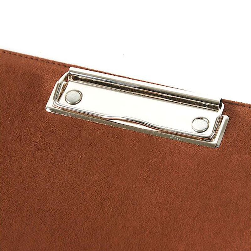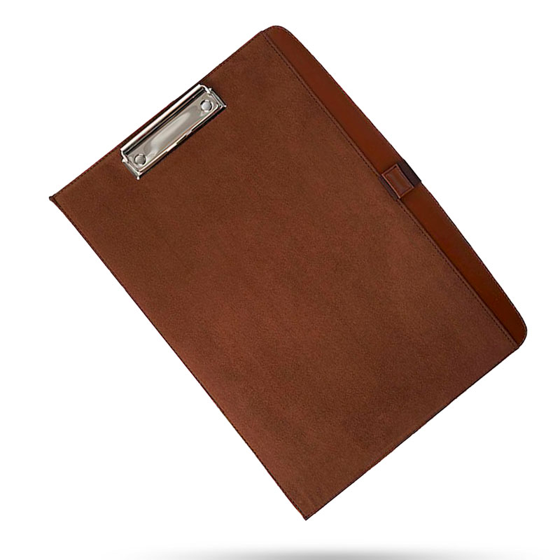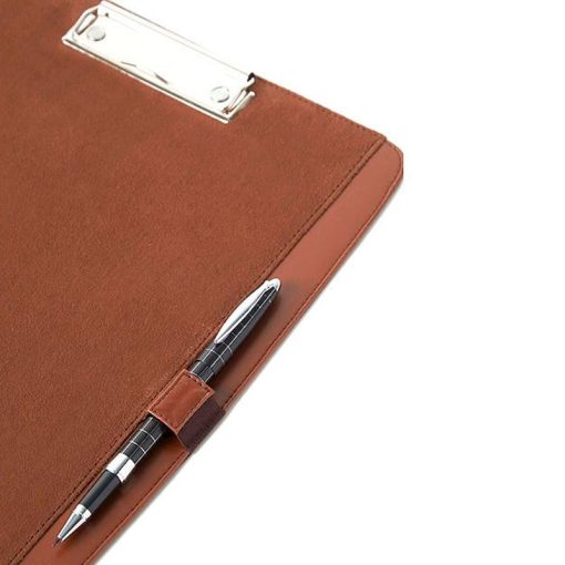Porta anotador confeccionado en simil cuero color marron con clip metálico, porta bolígrafo con elástico. PF1463