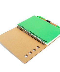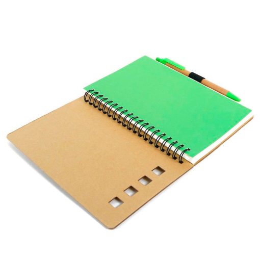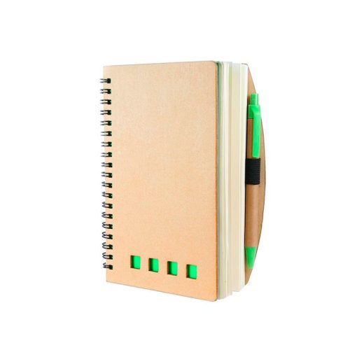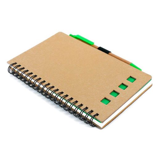 Cuaderno tamaño a5 con espiral negro y tapa de fabicada en cardboard eco dura. 80 hojas blancas lisas, sujetador elástico color negro y bolígrafo pulsador.