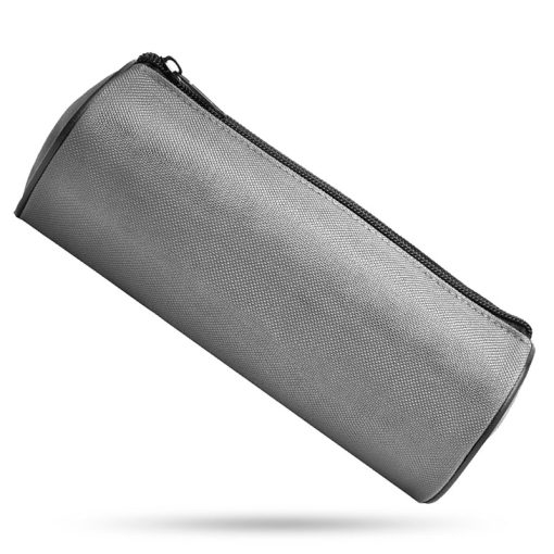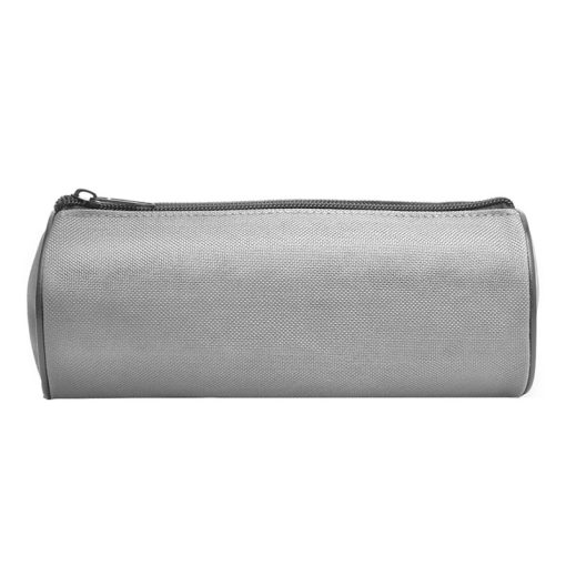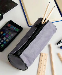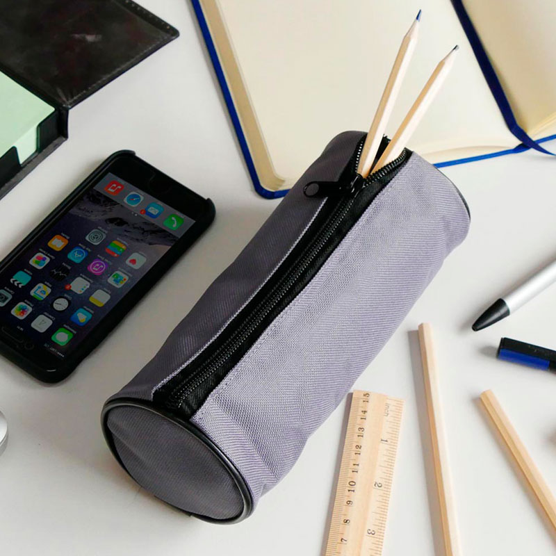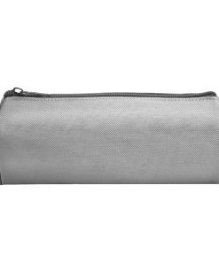 Cartuchera color gris confeccionada en poliester 600D con forro interior negro acolchado de espuma y cierre cremallera de color negro. Tiene largo 192 mm y un diametro 80 mm.