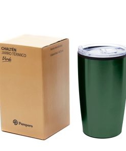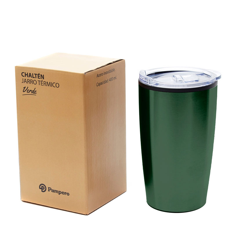 Jarro termico Chalten de Pampero hecho en acero inoxidable, con tapa a presión cristal clear y pico deslizable para evitar derrames.