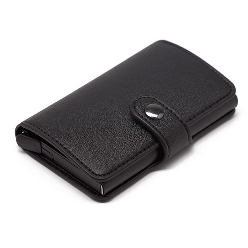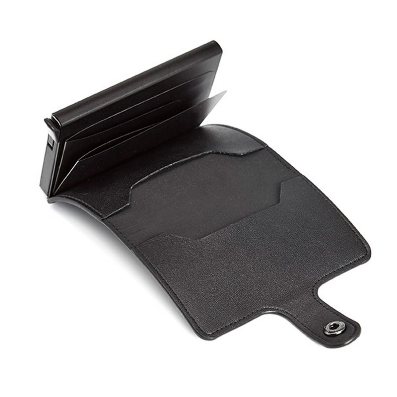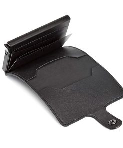 Billetera con tarjetero diseñado para evitar lectores RFID que puedan poner en peligro la seguridad de tu documentación, tarjetas de crédito o débito. Cierre con botón y capacidad de hasta 6 tarjetas. Tire de la palanca y las tarjetas se deslizan hacia afuera, no se caerán cuando estén boca abajo.