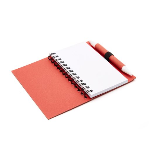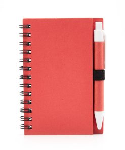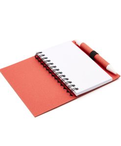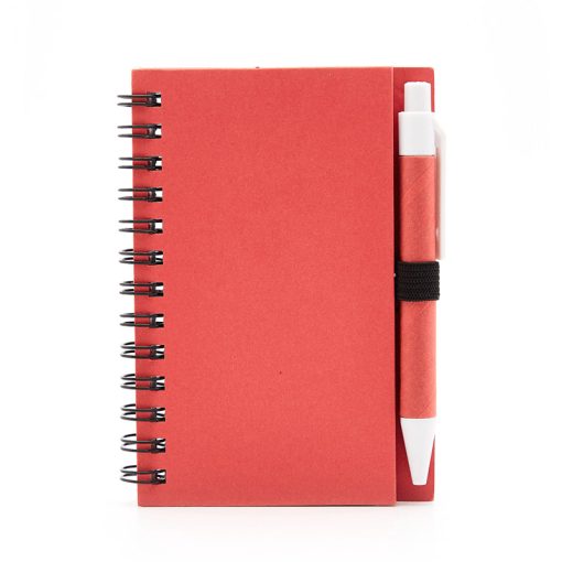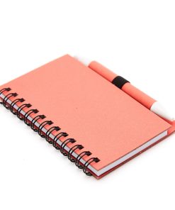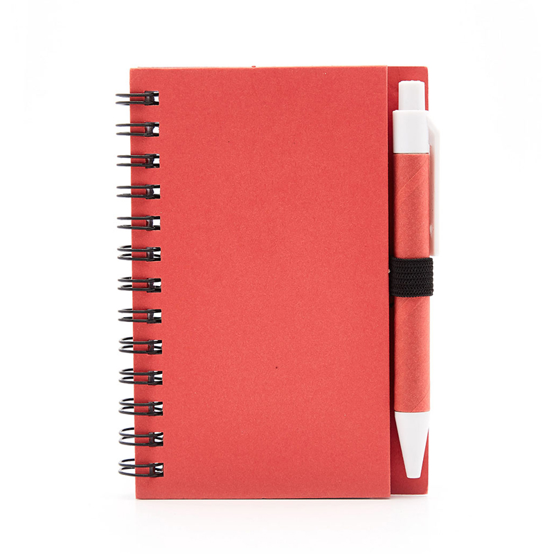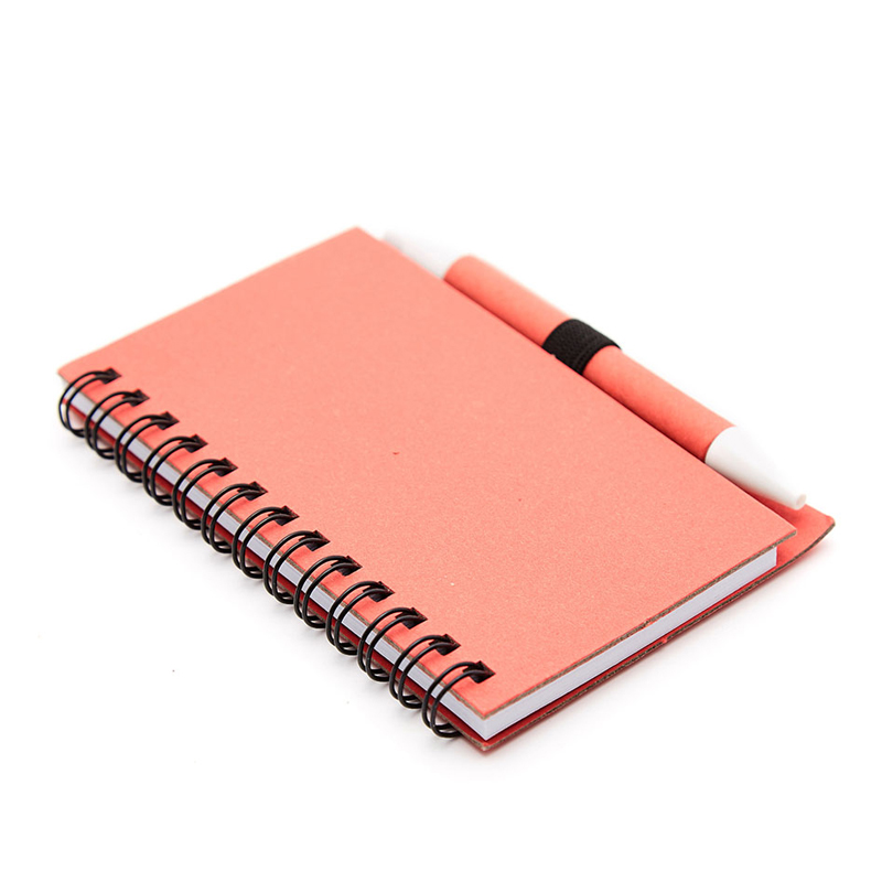 Cuaderno tapa dura espiralado, ecologico realizado Cardboard de color tamaño A6. Incluye 50 hojas lisas de 80 gr, bolígrafo con pulsador con clip en el mismo color que el cuaderno.
