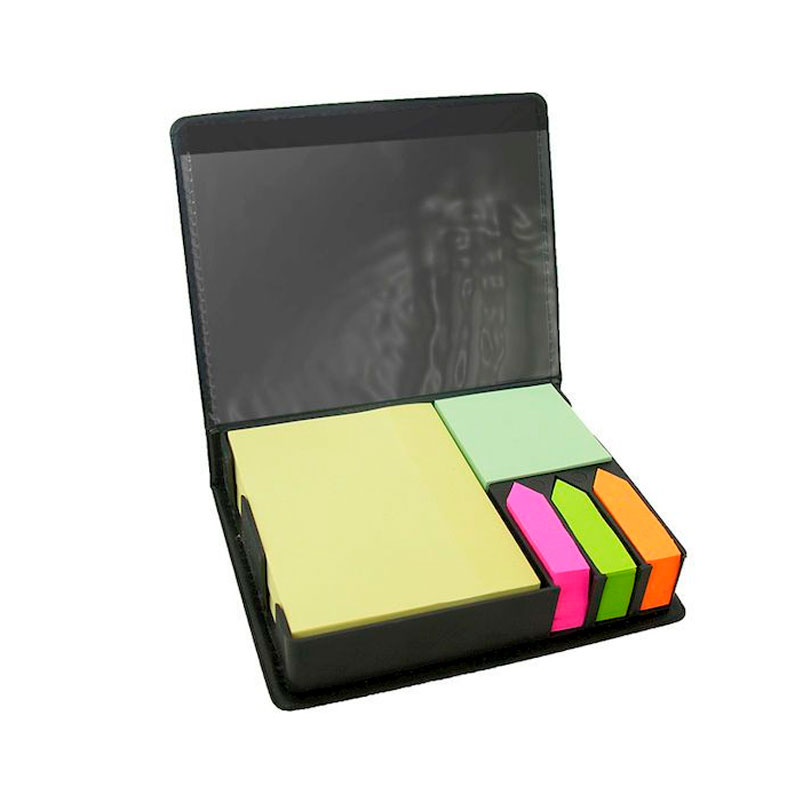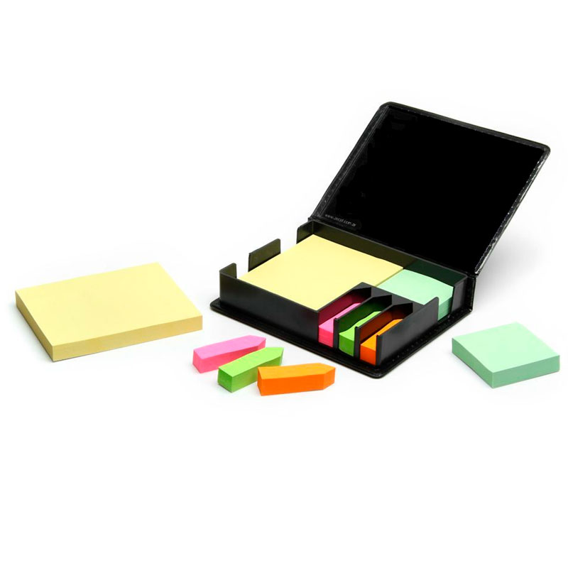 Kit Porta Notas Adhesivas fabricado en Eco cuero. Incluye 2 blocks de 7,2 x 9,8 cm de 100 hojas c/u. 2 Mini blocks de 4.7 x 4.7 cm de 100 hojas c/u y 3 banderines de 1.2 x 4.5. Todas las hojas son autoadhesivas