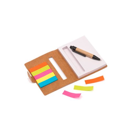 10,5 x 7,8 x 1,1 cm Cartón. Material reciclado. 80 hojas lisas blancas. 5 block autoadhesivos rectangulares de diferentes colores. 1 bolígrafo de tinta negra.