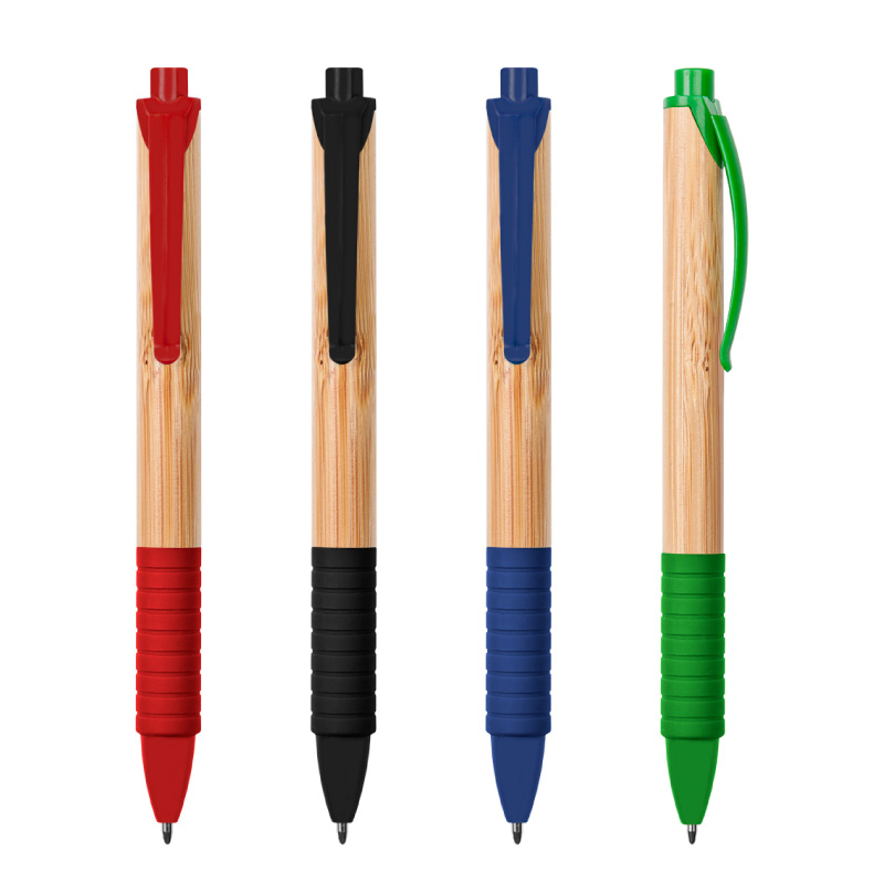 Bolígrafo Bambú Lucky, con cuerpo de Bambú. La puntera y el pulsador son de plástico, el grip es engomado de color.