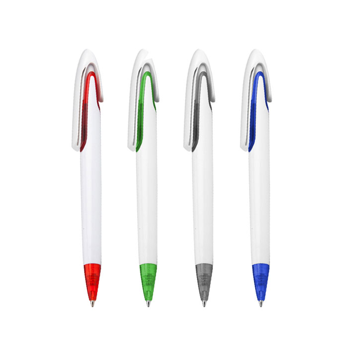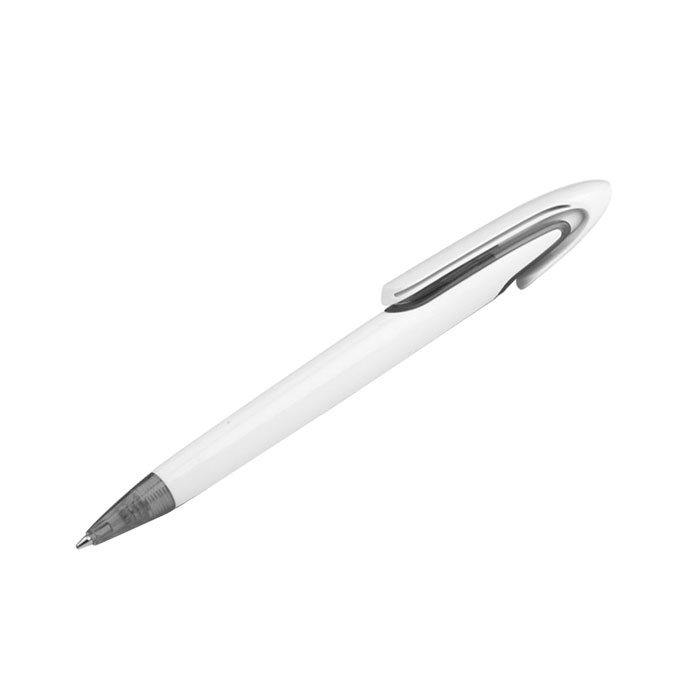 Bolígrafo plástico Bowie de cuerpo color blanco y detalles en color. Cuerpo y clip plástico retráctil.