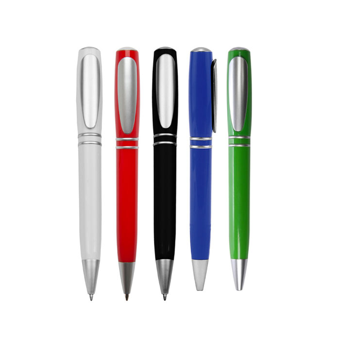 Bolígrafo plástico Space de cuerpo de colores. Sistema de apertura de medio giro. Clip y puntera color plata.