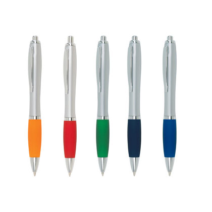Plástico. Cuerpo curvo, pulsador, clip y puntera color plata. Grip de goma de color. Retráctil. Tinta negra.