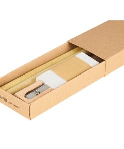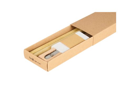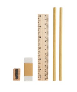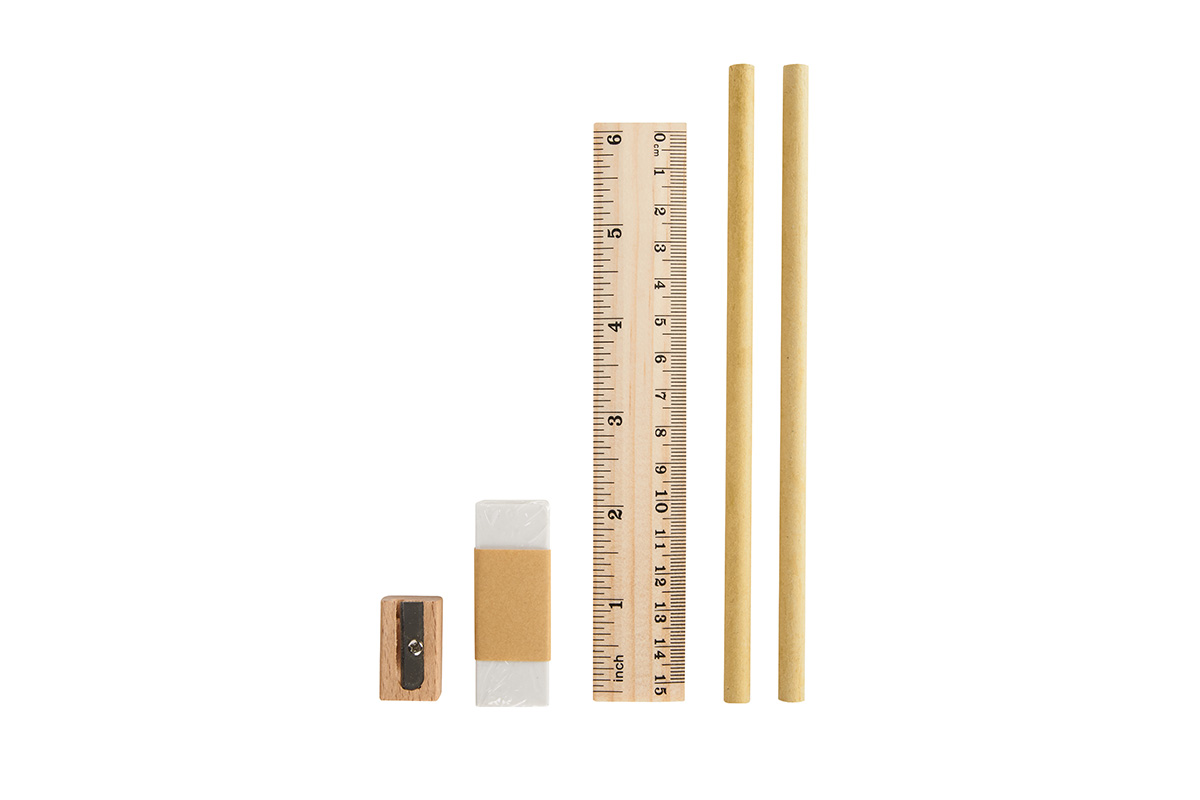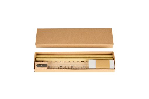 Set de 2 lápices de grafito, mina de 2mm, una regla con unidades de medida en mm cm y pulgadas de 15 cm de largo, una goma y un sacapuntas, realizado en madera de pino y Cardboard ECO
