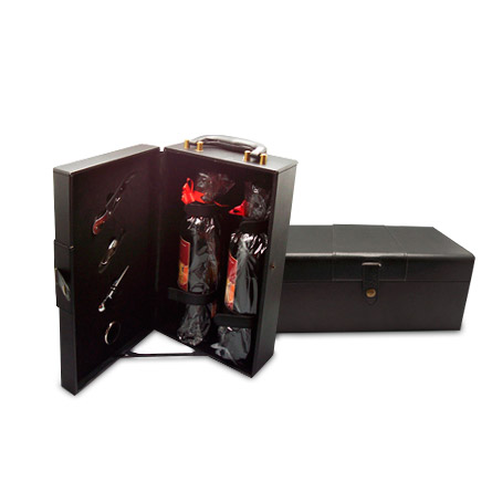 Caja de eco cuero, con espacio para 2 botellas, sujetadas mediante 2 tiras de eco cuero cierre velcro. Incluye 4 piezas: Aro corta gota, tapón, tapón con pico vertedor y destapador.