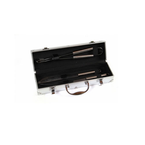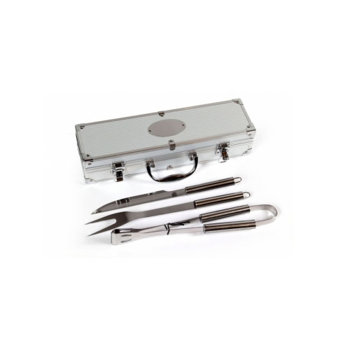 Set parrillero para asador en maletín de aluminio. Cuenta con 3 piezas: pinza, tenedor y cuchillo.