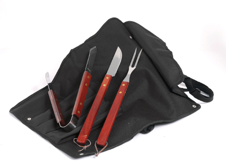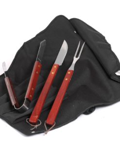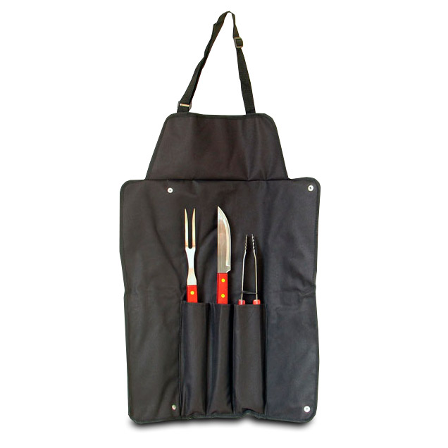 4 elementos: delantal, pinza, cuchillo y tenedor realizados en madera y acero inoxidable.