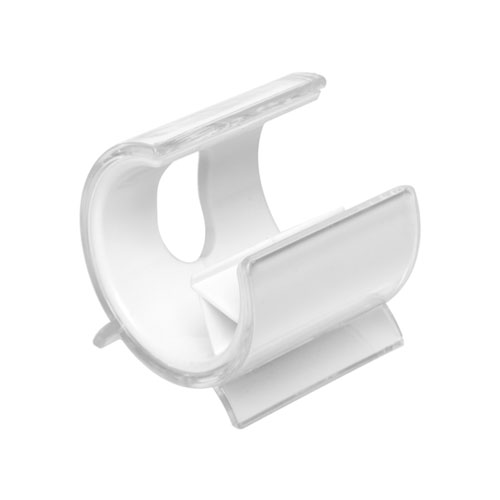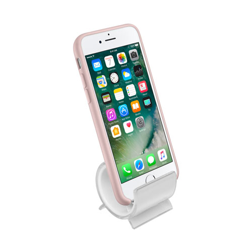 Soporte para celular fabricado en plástico. El celular se apoya en el interior del soporte.