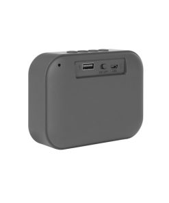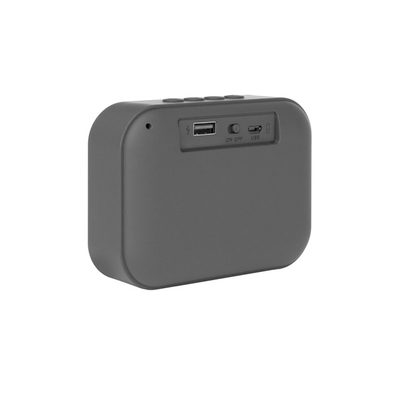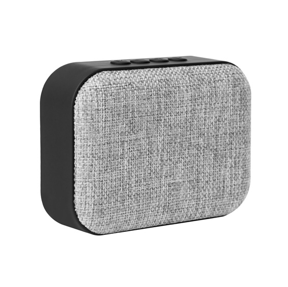 Parlante plástico engomado y tela. 11 x 8 x 4 cm. Parlante bluetooth. En la parte superior tiene botones de modo, volumen y play. Con el botón Modo se elige entre las opciones de Bluetooth y USB. Opción de responder llamadas desde el parlante pulsando una vez el botón Play cuando entra la llamada. Base con detalles antideslizantes. Alcance de transmisión hasta 10 mts. Voltaje DC 5V. Incluye cable USB para carga.