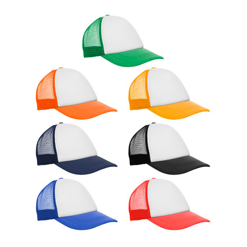 Gorras trucker realizadas en Polyester de 5 gajos. Frente de color blanco y zona trasera con tela red de color, el ajuste es con broche plástico. Presentamos variedad de colores.
