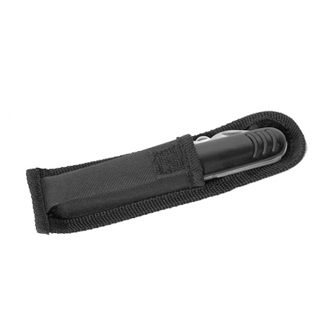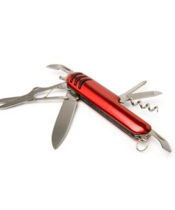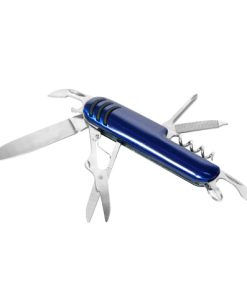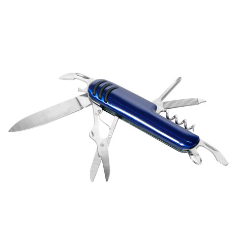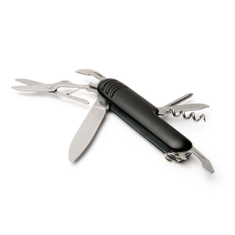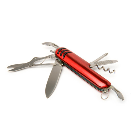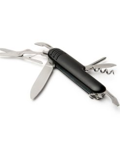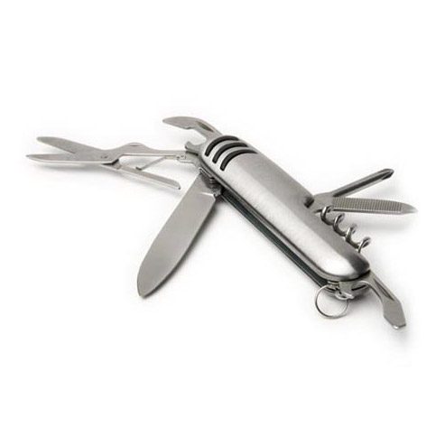 7 funciones: navaja, tijera, sacacorcho, destapador, abrelatas, destornillador, lima. Con funda.