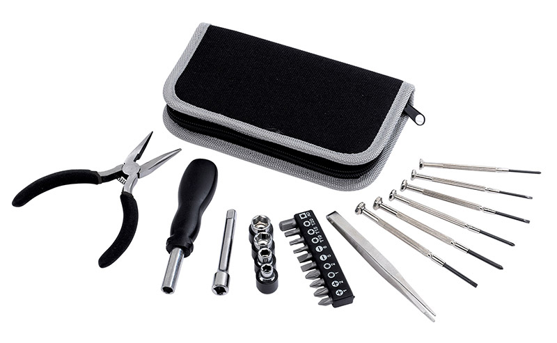 Set de Herramientas «Compact». 24 piezas. Destornilladores, pinzas, complementos. Estuche negro con cierre.