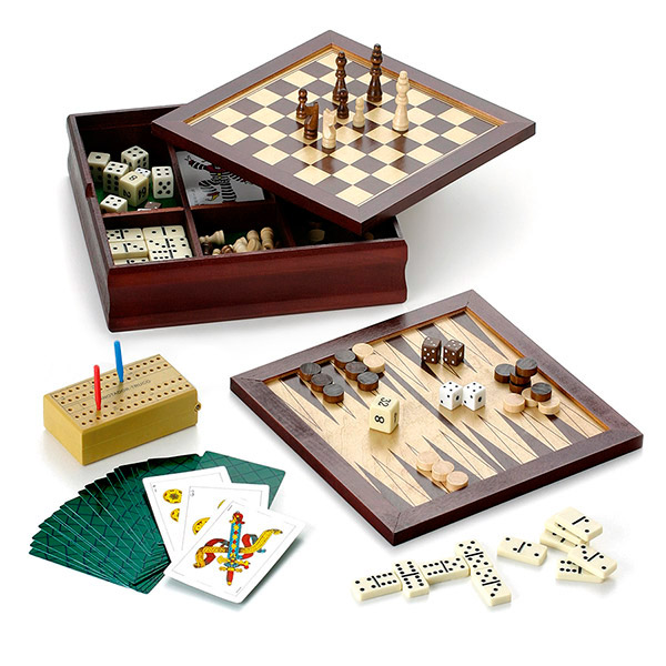 Juego 7 en 1. Caja de Madera con Juegos 7 en 1. Ajedrez, Damas, Backgamond, Domino, Dados, Naipes y Cribbage.
