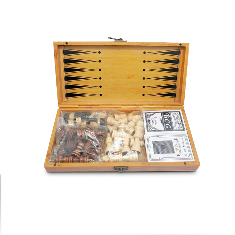 Set de 4 Juegos: Ajedrez, damas, poker y backgammon. Estuche en Madera. Medidas cerrado: 29 x 14 cm. 4,7 cm.