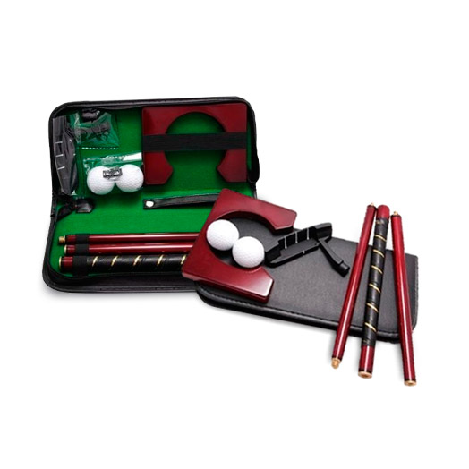Set de golf en estuche de cuero sintético con manija. El putter viene con cabeza de titanio.