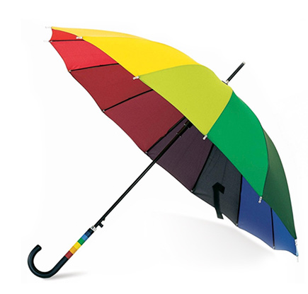 Paraguas Arcoiris con gajos multicolor y mango largo forrado en ecocuero.